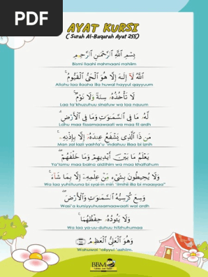 AYAT KURSI RUMI Allahu la ilaha illa Huwa Al-Haiyul-QaiyumLa takhuzhuhu sinatun wa la nawmLahu ma fis-samawati wa ma fil-ardMan zhal-lazhi yashfau indahu illa bi-izhnihiYalamu ma baina aidihim wa ma khalfahumWa la yuhituna bi shaiim-min ilmihi illa bima shaaWasia kursiyuhus-samawati wal ardWa la yauduhu hifdzhuhuma Wa Huwal Aliyul. Ia merupakan antara ayat al-Quran yang terawal diterapkan sejak kita di bangku sekolah. ʾĀyat al-Kursī is the 255th verse of the 2nd surah of the Quran Al-Baqarah.